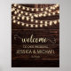 Bröllop välkomstbanderoll/skylt med en rustik lingträdsutformning med sträng ljus.