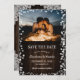 Fotot från Rustic-landsbyggsbröllopet sparar datumkortet med lingvirke som är försedd med övertäckning på framsidan och två hörn från bjälkbålen och snöre i den vita blommigten på baksidan. Skicka ut det här fotot från den rustiska chicen bröllop sparat datumet för att komplettera din bröllopsfest från land, bakgården eller ladan. Du kan enkelt anpassa den här romantiken genom att spara datumet med din foto- och bröllop-information.