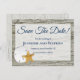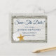 Den här strandkonstruktionen har en drivträbakgrund, med en sanddollar och stjärnfisk i hörnet. Den kontrasterande blå texten påminner om havet och är lätt personlig att tillkännage ert eget bröllop-datum.