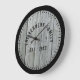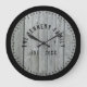 Rustic farmhouse-väggklocka i grått-bedrövad träbakgrund och svart ram.Anpassa till din familj namn och etablera år.