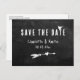 Brevkort från anpassningsbar bröllop spara datum med ritbord med bröllop-detaljer, hjärta och pil på en svart bakgrund i krita.