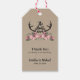 Romantisk rustik land stil hjort antlers + rosa ros banderoll för blommigt + typografi för personligt bröllp-gåva/möhippa-märkre. **Samordnade mallar för den här bröllop-sviten finns i samlingen som visas nedan eller genom att klistra in URL:en i webbläsaren: https://www.zazzle.com/collections/the_hunt_is_over_wedding_collection_3-119937951722008190?rf=238919973384052768&CMPN=share_dclit&lang=en&soc