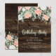 I dessa rustiska och trendig födelsedagsfest inbjudan finns vattenfärgade blommor och löv i mjuka skuggor av rosa, persikor, vita och blå, med en modern accent av fingerade punkter från guld, på en brun träbakgrund.