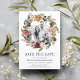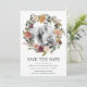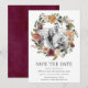 Vår Rustic Bloom sparar datumkortet ramar din favoritbild på förlovningen med en rund krans av färgat ro och peonblommor i rikens höstskuggor av Marsala, burgundy, rosa och grädde, accentuerade med mörk grönt löv och löv. Ett modernt val och val av elegant för höst- eller höstbröllop. Anpassa med namn, bröllop-datum, plats och bröllop webbplats med hjälp av fält.
