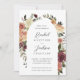 En vacker bröllopsinbjudan för fallande blommigt med namn i kalligrafi-skript med text, kapslad i en båge av vattenfärgblommor och botaniska ämnen i muterade jordtonsnyanser av burgundisk marsala, , elfenben och sage-grönt. Anpassa med din bröllop-information under.