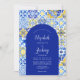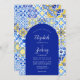 Den här strålande designen har en bakgrund mönster av blå, gult och vit vattenfärg portugisiska plattor eller azulejos. Anpassa den med namnen på briden och trimningen i det vita kalligrafiskriptet och den återstående texten i en kombination av sans serif, copperplate och italics på en blå bågform. En matchande ruta mönster visas på baksidan.