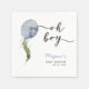 Papper napkin med vattenfärg som illustrerar en blå ballong med grönt garland. I texten står "åh boy".