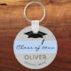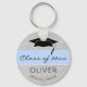 Den moderna orustiska blå klassen av nyckelkedjan Studenten med student namn, namn, klassår och svart studentmössa. Blue rand på grått-rustik bakgrund. Anpassa nyckelkedjan och göra en underbar personlig till en gåva och håll för ett student.