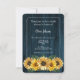 Skapa ett unikt inbjudan med ett Rustic Blue Sunblomma inbjudningskort för möhippan. Inbjudan har en bakgrund av rustiskt trä med en elegant av solblommor. Anpassa med bridens namn tillsammans med möhippans detaljer. Ytterligare bröllop-förråd finns även med den här utformningen.