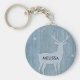 Nyckelkedja med blå bakgrund av faux-wood. Skickat över ytan är en silhuett av en renar med stora antenner.