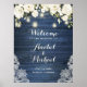 Välkomstskylt för Rustic Blue Wood Snöre Blommigt White Bröllop. Blommigt Burgundy Mason Burk Bröllop Välkomstskylt. Välkomstsignatur för Rustic Wood String Ljus