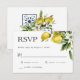 Detta vackra medelhavsmemat med bröllop-responskort framkallar rustik charm. Den har ett sjudande hörn arrangemang av färskfärgscitroner i citruscitronens gult och grönt med vita blommar. Det är ett vackert val för bröllop i vår, sommar eller fall. Oavsett om du reser till Medelhavet, Amalfi Kusten, Positano, Toscana eller är värd för bröllop i en solig sydlig Kalifornien-citrusodling eller annan destination, är denna charmerande OSA ett uppfriskande val för din dröm bröllop. Utformningen är både enkel och elegant med ett minimalistiskt utseende som påverkas av den soliga citronfrukten.