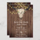 Den här orustiska Boho Save the Date bröllop-annonsen har en blommigt ko skalle med söt gult blomsträng ljus på en barwood-bakgrund. -