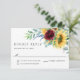 En personligt bröllp-OSA kort med en underbar bukett av rustiska vattenfärger solblommor, burgundy ro och eukalyptus greenery. På framsidan finns ett svarsdatum som du behöver med en platshållare för gästerna till skrivan av namn och kontrollera om de kommer att närvara eller om de inte kan närvara. Den här utformningen är ett underbart val för sommar- eller fallbröllop på olika platser eller platser.