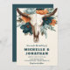Fira din kärlek med den här roliga boho-bröllopsinbjudan med en fet skallpropp av ko omgiven av rikens mörk teal och brända blommigtar av orange. Perfekt för westernt, ökenfritt eller utomhusfritt bröllop. Den här designen fångar både en elegans och en frikostig charm. Anpassa typsnitt och formuleringen så att de stämmer överens med er unika vision om ett oförglömligt firande.