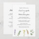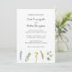 Boho All in One Wedding Investigation med vattenfärg målade vilda blommor i en enkel layout vid grund tillsammans med namn i ett vismiskt skript. På baksidan finns en mall som fungerar som tilläggskort, där du kan lägga till dina gästuppgifter. Den här botaniska blommigten på ett bröllop är underbar för en rustisk stil vår eller sommar bröllop.