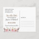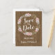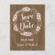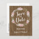 Rustic boho bröllop spara datum vycard med vattenfärgade blommor i rosa, på träbakgrund.
