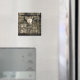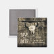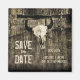 Rustic westerna bröllop-bull-skalle med horn vintage stil spara datum meddelande kvadratiska kylmagnet. Ranch grunge struktur. Barn wood cowboyen inspirerade. Antique sepia brun bison bra art. Image copyright Marg Seregelyi Photography.
