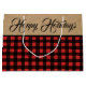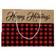 Underbarare presentväska i en rustik tema med lumberjack buffalo-kontroll i svart och rött. Toppen av säcken har ett faux brun trendig papprare utseende! Frasen"glad helg" i svart elegant svepande skript. Den här väskan är underbarare för din helgdag ge.