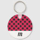 En snyggt monogrammad nyckelring med en röd och svart buffelkontroll mönster på båda sidor. Anpassa med en inledande sida som visas på en vit panel på nyckelringens framsida.