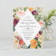 Den här eleganten är stil bröllopsinbjudan med en neutralt beige geometrisk diamantform som är inramad av sommar- och fallvattenblommor, inklusive ro, dahlias, peonblommor och grön, i en fantastisk höstpalett med burgröd, gyllene gult, persikofärgad orange, rosa och gröntens nyanser. Anpassa snyggtens mörk-grått-text för din speciella händelse. Innehåller en färg för neutraltens beige bakgrund som kan ändras. En brinnande röd bakgrund med texturerat utseende döljer kortets baksida.