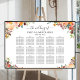 Snyggt bröllop-sätesschemat poster formgivning med ett monogram av briden och dagstidningen namn och bröllop, anpassningsbar malltext för bordsnummer och gästnamn som är inramad av en sommarkrans och sjunkvattenfärgade blommor, inklusive ro, dahlier, blommor och grönska, i en fantastisk höstpalett med burgundröd, gyllene gult, persikor, orange . och nyans av rosa.