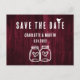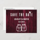 Minimalistiskt vykort i bröllop spara datum med modern kalligrafi som är perfekt för en burgundisk rustik land/backyard/ladagar-bröllopsfest.