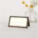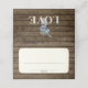 Rustic burk med blåa blommor över laduvirbakgrunden, vikta sittplatskort med vit yta för handskrift av namn och bordsnummer och personlig namn och meddelande på baksidan.