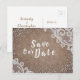 Elegant, vit vintage snöre och gnistra silver glitter på rustiska burlaved, spara vykorten. underbar för rustiska bröllop, lada bröllop, landsbyggsbröllop och vintage bröllop. Visa alla matchande delar i samlingen.