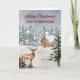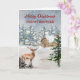 God jul för broderkort med en charmerande scen av en land-sovstuga i skogen med en hjort i snö och en tankfull vers.