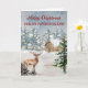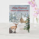 God jul för far i ett juridiskt kort med en charmerande scen av en rustisk land-stuga i skogen med en hjort i snö och en tankfull vers.
