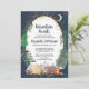 Rustic par-babyduschinbjudan med en söt illustration av skogsdjur med tält-camping i bergen och skogen, ett överlägg av guld-stjärnor och måne i ett natt-himlar och "Äventyr Awaits" och namn i mor och far i ett mörk midnattblått skript.