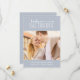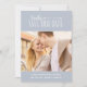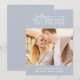 Den här roliga, neutralt grått-blåa-spara datumkortet innehåller texten "Vänligen spara vårt datum" i handskrivet typsnitt-stil för ett DIY-utseende. Anpassa med information om bröllop och favoritfoto. Ytterligare foton och text kan läggas till på kortets baksida.