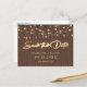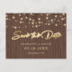 Postkort av personlig rustic chic bröllop spara datum med en rustik träbakgrund som är försedd med strängen ljus och ett elegant-skript. Du kan enkelt anpassa den här chicen genom att spara vykortet för datum med information om bröllop. Vi hälsar anpassningsbarna välkommen.