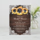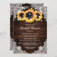 Vacker rustik solrosa inbjudningskort för möhippan med solblommor på en lada-bakgrund, med vit blommigt snöre och sträng ljus. Matchande objekt är tillgängliga.