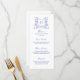 Den blå vintagen inspirerade babyduschmenyn med en vit hand plockade-blommigt monogrambaserad vapensköld med fjärilar och ett snabbt handskrivet teckensnitt.