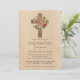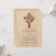 En rustisk blommigt för en flickas första samfund. Det finns ett stort trä kor ovanför texten, med en ro-andetag från rött, rosa, vitt och gult vild rosor på den. "Bekräftelse" från ord och namn är skrivna i ett brunt handskript. Bakgrunden och baksidan är ljusbrunt trä. Utandningen av vintage ro sker av målarten och botanisten Pierre-Joseph Redouté (1759-1840), från bok "Les Rosor"-fronten av Pierre Joseph Redouté och Claude Antoine Thory, som publicerades 1817, nu offentligt.