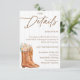 Dela all viktig information med stil med detta Rustik Country Bröllopsdusch Detaljerkort med vintage cowgirl-stövlar, en cowboyhatt, blomsterdekorationer och en trästrukturerad bakgrund. Perfekt för västerländska, ladugårds- eller landsbygdsinspirerade bröllopsduschar, detta infogningskort är idealiskt för att inkludera information om gåvor, vägbeskrivningar, boendeinformation eller speciella noteringar. Anpassa det för att matcha din händelse och ge dina gäster allt de behöver veta, insvept i rustik charm!