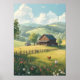 Bring a touch of quiet country life into your home with this charming summer landscape artwork. The scene features a cozy wooden cabin nestled in rolling golden hills, surrounded by lush forests and bright wildflowers swaying in the breeze. Chickens roam freely in the sunlit meadow, adding warmth and life to the peaceful setting.