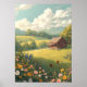 Bring a touch of quiet country life into your home with this charming summer landscape artwork. The scene features a cozy wooden cabin nestled in rolling golden hills, surrounded by lush forests and bright wildflowers swaying in the breeze. Chickens roam freely in the sunlit meadow, adding warmth and life to the peaceful setting.