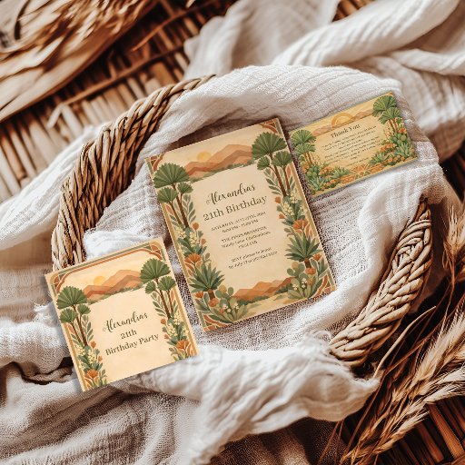 A warm desert-inspired birthday design featuring soft canyon landscapes, cactus botanicals, and earthy neutral tones. The vintage botanical frame and natural color palette create a timeless southwestern look, perfect for milestone birthdays or elegant outdoor celebrations. Ideal for anyone who loves desert scenery, rustic details, and refined botanical styling.