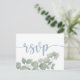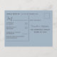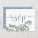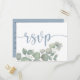 Enkelt och modernt vykort för bröllop OSA med typografi av eleganten i dammblått mot vit bakgrund, med tillsats av eukalyptus vattenfärgblad. Anpassa enkelt.