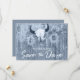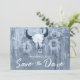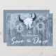 Den här westerna sojabönor av rustiskt dammigt blått soja Spara Platt-kortet är ett underbart sätt att informera dina gäster om din bröllopsdag. Rodeo cowboyskalle med hornen land blommigt struktur, lada vintage bohemian. Farmhouse cowgirl stil-design. Leta efter matchande produkter i den här samlingen. Upphovsrätt Marg Seregelyi Fotography.