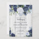 En inbjudan till elegant med bröllop-uppgifter omgiven av vackra blommor i blå, vit och rik marin på en vit, rustik träbakgrund. Du kan lägga till ett eget speciellt meddelande och ändra teckensnittet stil genom att gå till anpassningsmenyn. Inbjudan är en del av en vacker matchande bröllop-svit som kan vara helt personlig.