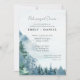 Temapartyets vattenfärgsberg Rustic rehearsal middagsbröllopsinbjudan har vattenfärg träd och berg på en dammig blå vattenfärgsbakgrund. Typografin parar traditionell text med modern handskriven text. #WeddingInbjudningar #DustyBlueWedding #WeddingInbjudes