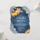 Den här roliga, dammiga, blå bröllopsinbjudan med solblommor och snöre på en lada-bakgrund är perfekten för att bjuda in dina gäster till din vackra, dammiga blå bröllopsfest som inspirerats av solblommor.