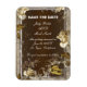 Rustisk brun bakgrund med vit ros och guld bröllop ringar. Detta vackra spara datum magneter är en snyggt, ett långvarigt sätt att tillkännage er stora dag. Anpassa magneten genom att ändra texten i fält. Du kan ändra teckensnittet stil, storlek och färg.