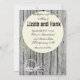 Rustic grått-väftade plankar av trä är bakgrunden till denna charmingbröllop. En dekorativ krans av blommor, hjärtan och snöre dekorerar grund på kortet och en rund dekorativ sfär med löv och blommor är centrum för kortet med all information. Land chic på sin bästa plats.