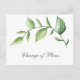 Brevkort för uppskjutning av Rustic botanical bröllop med en enkel utformning med en grönt vattenfärg som målas med stor löv tillsammans med titeln "Byte av plan" på framsidan. Baksidan har ditt personliga meddelande och din returadress för enkel utskick. Detta vykort är ett underbart sätt att informera gästerna om att bröllop har skjutits upp.