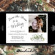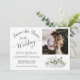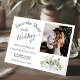 Det här vackra bröllop spara datum-kortet har en rustik boho-chic med lacy script calligraphy och ett kluster av handmålade löv av eucalyptus och greenery i nyanser av mint, moss och sage-grönt. Det finns plats för ditt foto, parets placering i namn & bröllop. Elegant, snyggt och chic, det här kortet är ett underbart sätt att låta dina vänner och familj veta att spara datumet för din speciella dag.